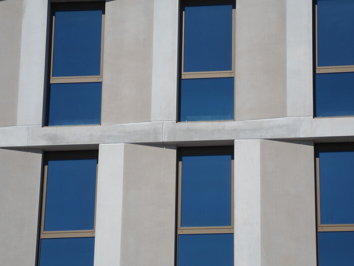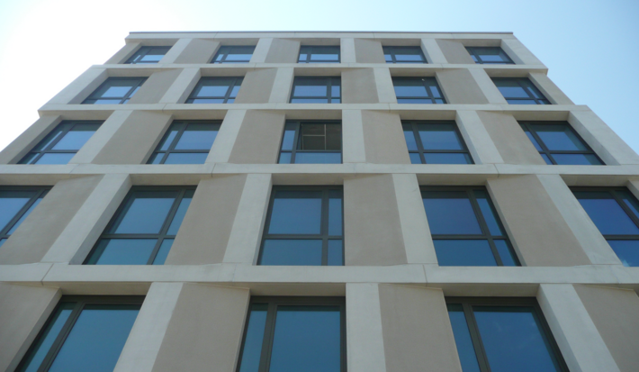 - Die Fassade gliedert sich in gleichmäßig angeordnete, geschosshohe, plastisch modellierte Fassadenelemente, die geschossweise variieren.