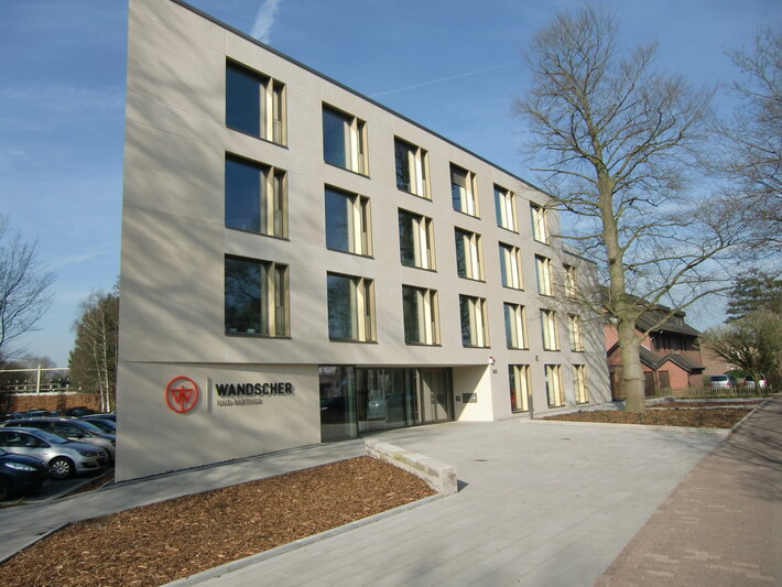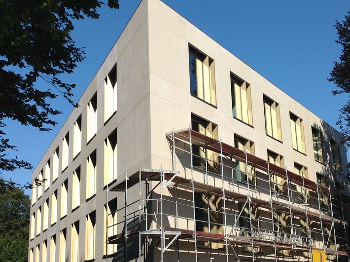 Bei der von kgb - Architekten und BWE-Bau gemeinsam entwickelten Fassade sind ca. 130 Architekturbetonfertigteilelemente als Vorhangfassade zur Ausführung gekommen.