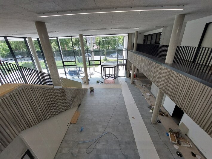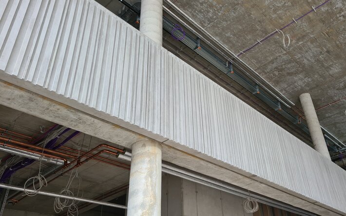 - hochwertige Architekturfassade im EG mit Strichcodeoptik in Graubeton, im Innen- und Außenbereich, Fertigung mit Sonderstrukturmatrize