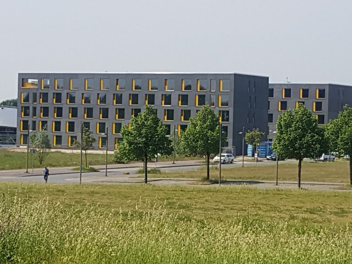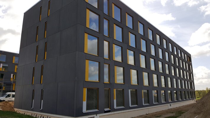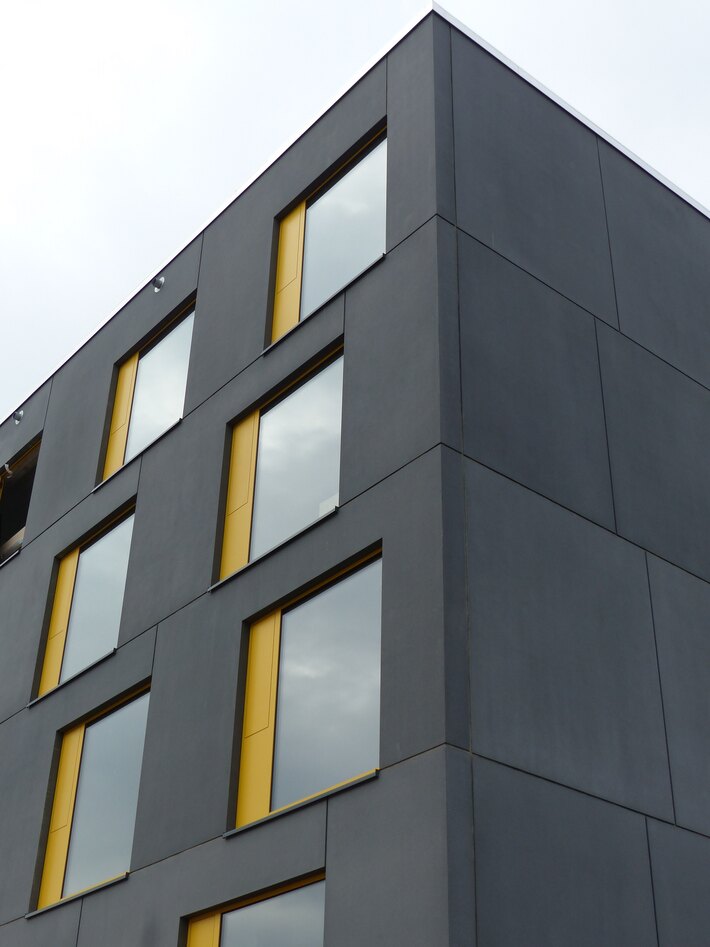 Aus dem Entwurf der Architekten Grimm & Kellner entsteht eine Architekturbetonsandwichfassade mit einem prägnanten Erscheinungsbild. Der 5-geschossige Neubau besteht aus zwei länglichen Gebäudeteilen mit jeweils 104 Wohneinheiten. Die Vorsatzschale erzielt mit ihrer Einfärbung in Anthrazit und der gesäuerten Oberfläche ihre besondere Wirkung. Die Sichtseiten der Vorsatzschale wird werkseitig mit einem Hydrophobierung versehen.