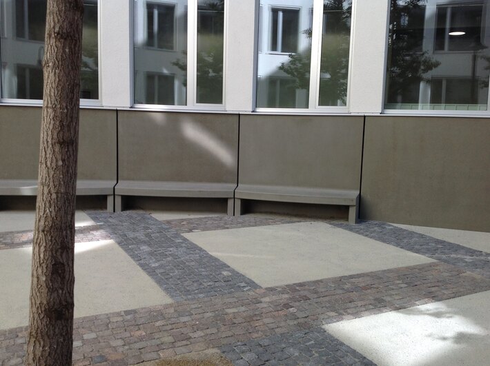 Ein besonderes Highlight ist der Innenhof mit den kombinierten Fassaden/Sitzelementen als Vorhangkonstruktion.