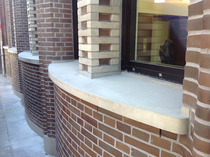 Die zierlich wirkenden Fensterbankelemente sind mehrfach ausgerundet und mit Aufkantungen zur Aufnahme der Verblendsteine hergestellt.