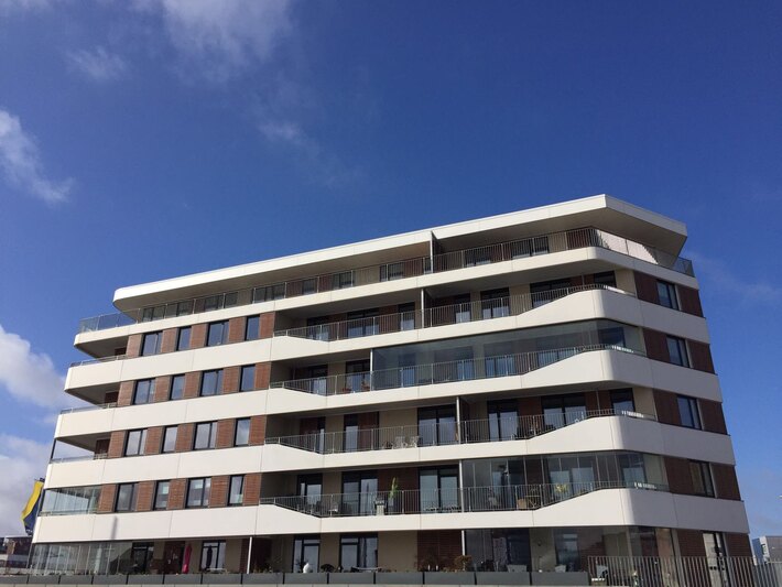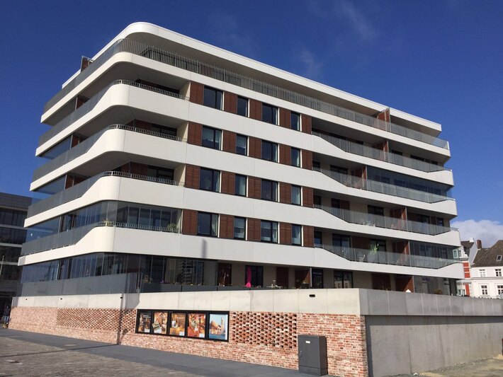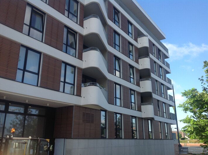 Dieses Gebäude erhält im Erdgeschoss graue Fassadenplatten, teilweise in L-Form. Die weiteren Geschosse bekommen Fassadenteile und Balkonbrüstungen in glatten weißen Sichtbeton, die in einigen Bereichen im Grundriss gebogen sind.
