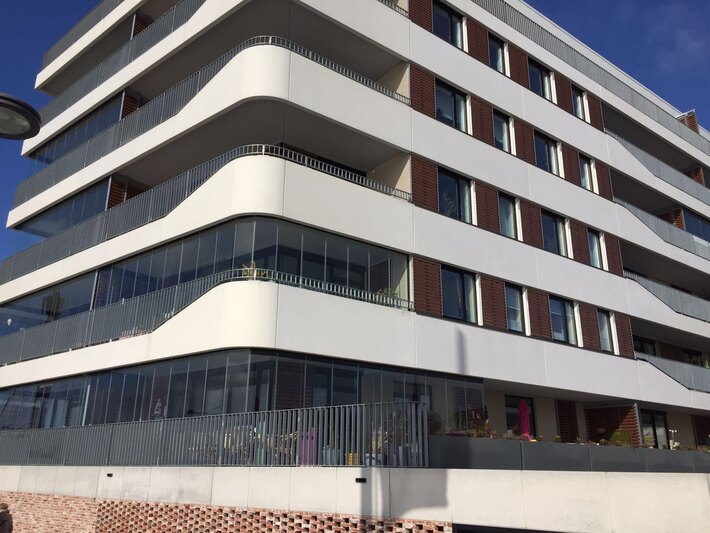 - Brüstungsplatten und Vorhangfassaden in weißer, schalungsglatter Ausführung.