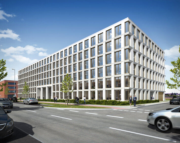 Der neue 6-geschossige Bürokomplex wird durch die hochwertige gesäuerte und weiß eingefärbte Architekturbetonfassade dem Anspruch seiner exponierten Lage in der Überseestadt Bremen gerecht. Die Fertigstellung ist für Dezember 2017 geplant. Die Büroflächen des Gebäudes können später flexibel an die jeweilige Nutzung angepasst werden. Ins Gebäudeinnere gelangt man über drei verschiedene Eingangsportale. Die Besonderheit dabei ist die Konstruktionsweise, die aus F-förmigen weißen Fassadenelementen besteht und das Gebäude trägt.