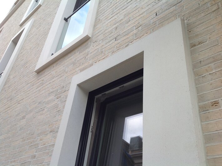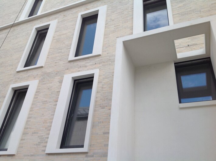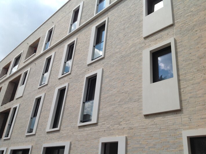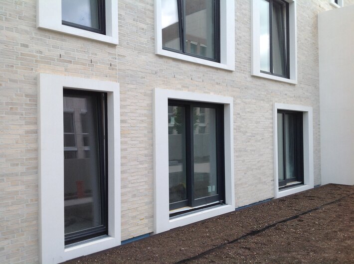 - Die in der Optik an Sandstein erinnernden Elemente werden nach einem Sondervorschlag mit Edelstahl Winkelbefestigungen durch BWE im Zuge der Verblendarbeiten montiert.